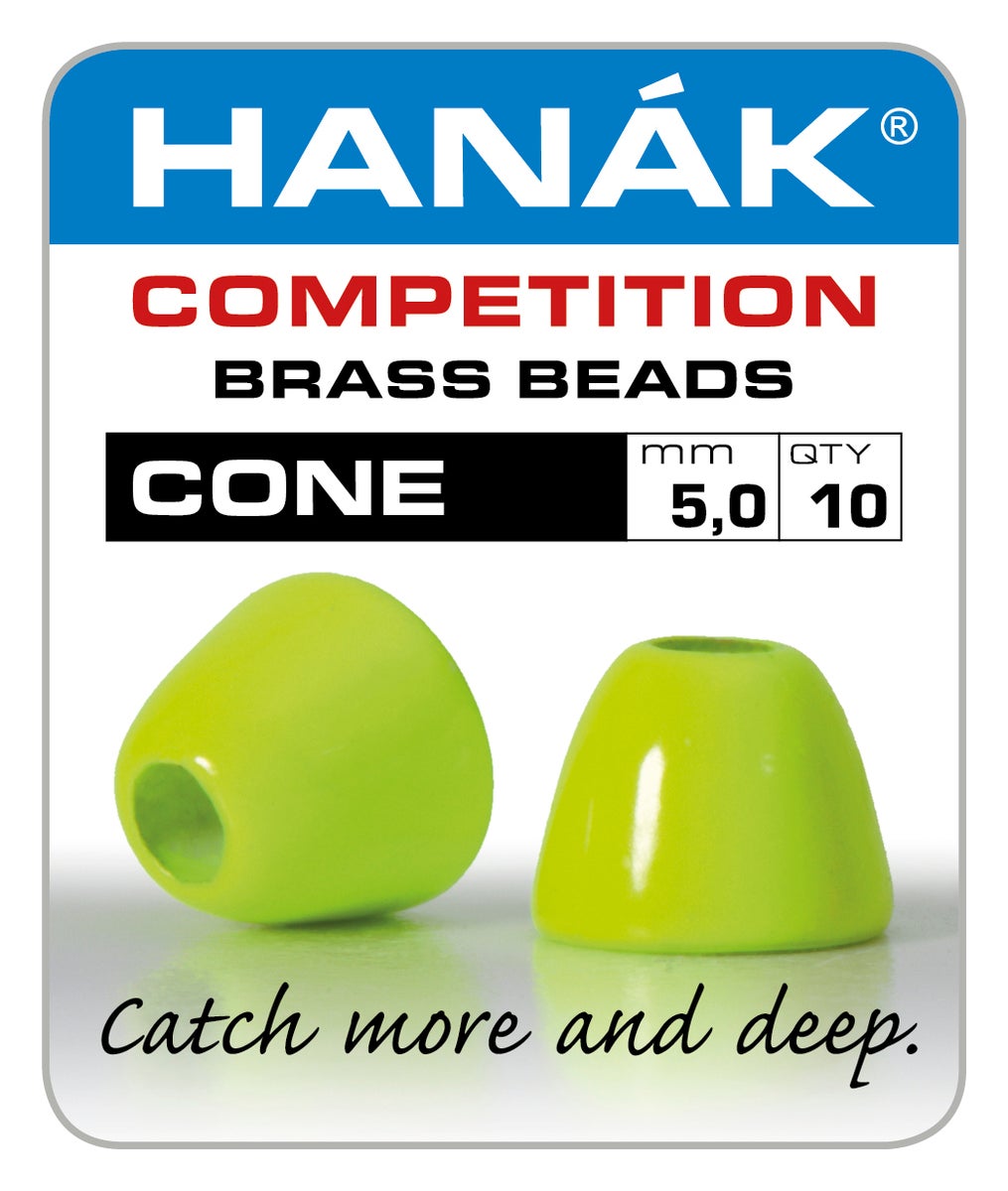 HANAK Cone Head on valmistettu messingistä ja ne sopivat hyvin erilaisten streamereiden,liitsien ja putkiperhojen kevyeen painottamiseen ja täten myös perhojen heittäminen on helpompaa kevyillä välineillä tungsten painotukseen verrattuna.